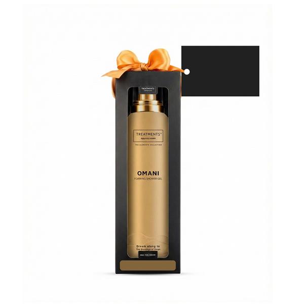 Pieniący się żel pod prysznic TREATMENTS, przeznaczony dla kobiet i mężczyzn, 200 ml, zapakowany w elegancki kartonik, sprawdzi się w codziennej pielęgnacji, dostępne różne warianty zapachowe: 03 – Ceylon, 06 – Mahayana, 08 – Omani, 11 – Uyuni, 16 – Zhejinag, 19 – Shinshiro, 21 – Verona, 98 – Samoa. Znakowanie produktu jest możliwe tylko na srebrnej lub złotej folii z czarnym nadrukiem albo na czarnej apli ze srebrnym lub złotym nadrukiem.