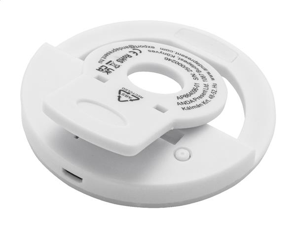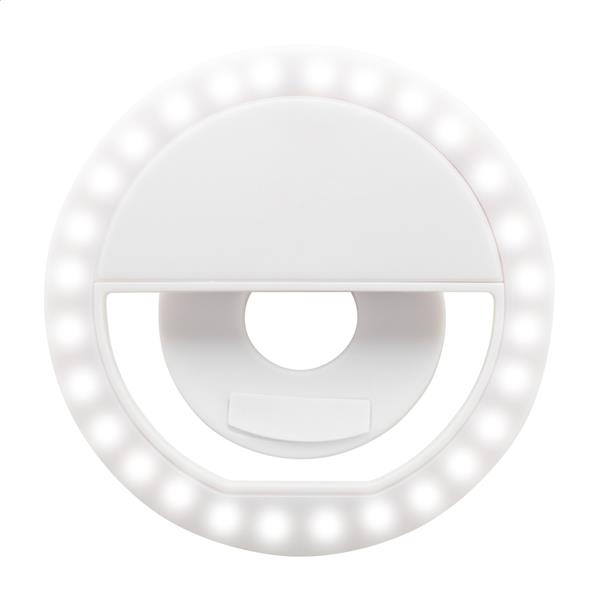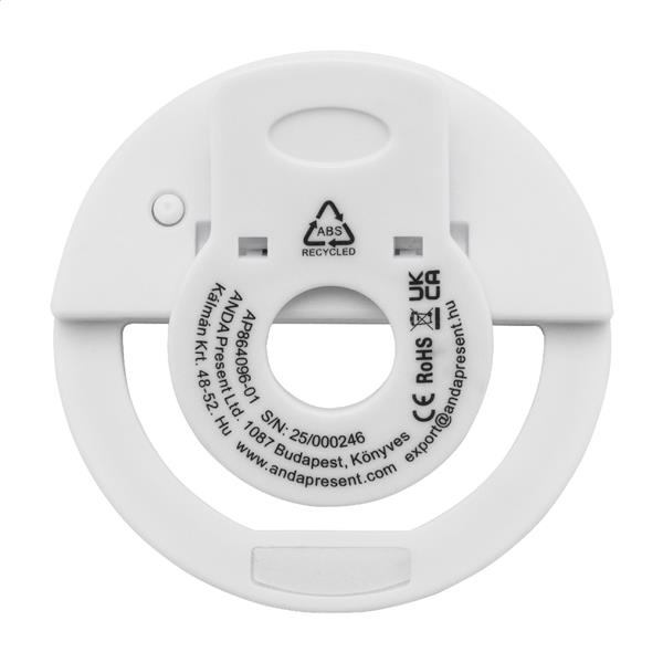 Pierścień świetlny do selfie z recyklingowanego ABS z 28 diodami LED do telefonów komórkowych. Z 3 regulowanymi poziomami jasności i wbudowaną ładowalną baterią (150 mAh). W zestawie kabel do ładowania USB.
