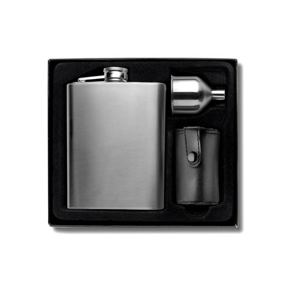 Zestaw, piersiówka 220 ml, 4 kieliszki 30 ml oraz lejek