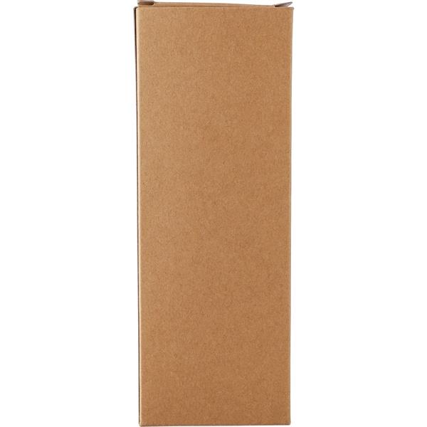 Piersiówka 230 ml z dwoma kieliszkami 40 ml, mocowanie u góry za pomocą pasków z przyciskami, zapakowana w brązowy kartonik, produkt wykonany ze stali nierdzewnej i PU
