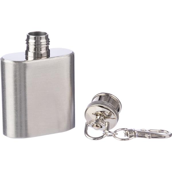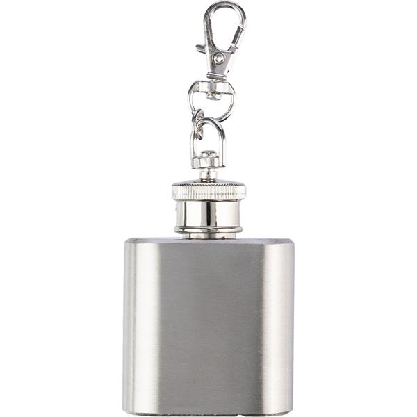 Brelok do kluczy „piersiówka” 30 ml, z karabińczykiem umożliwiającym przypinanie, produkt wykonany ze stali nierdzewnej