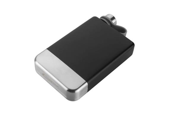 Piersiówka Schwarzwolf o pojemności 266 ml w czarno-srebrnej kombinacji kolorystycznej. Na spodzie ścianki umieszczono logo Schwarzwolf.