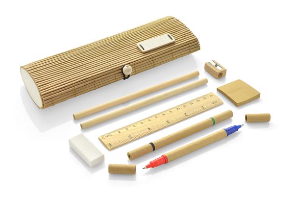 Bambusowy piórnik z ekologicznymi przyborami zawiera: dwa dwustronne długopisy (czerwony, niebieski, zielony i czarny), dwa ołówki, linijkę, temperówkę, gumkę do mazania oraz karteczki samoprzylepne. Ekologia, piękny wygląd i możliwość praktycznego zastosowania w jednym produkcie.