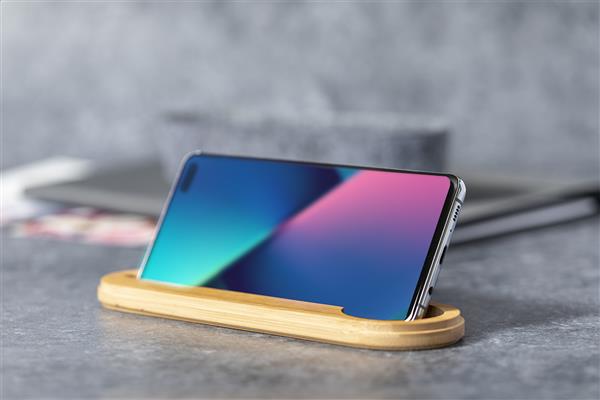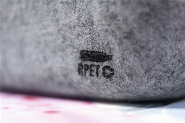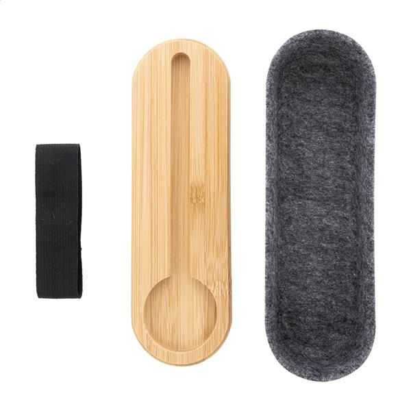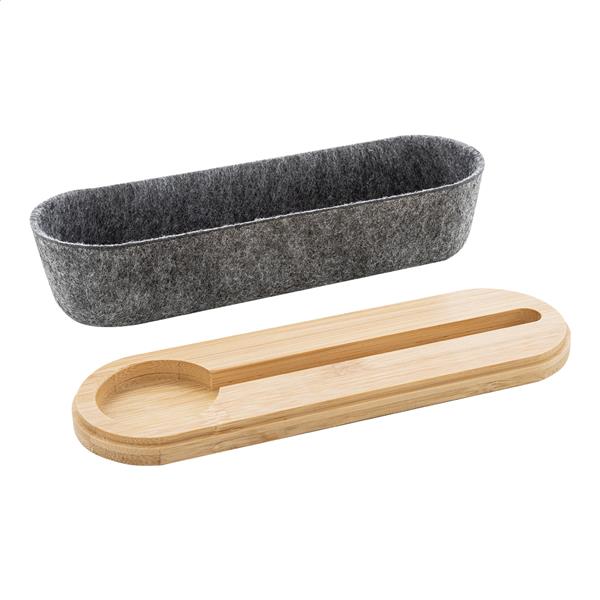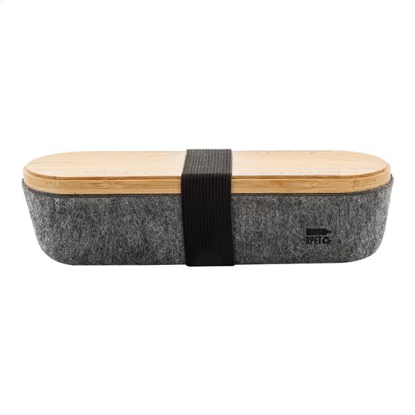 Filcowy piórnik z RPET z bambusową pokrywą i elastycznym paskiem. Z linijką i uchwytem na telefon komórkowy.