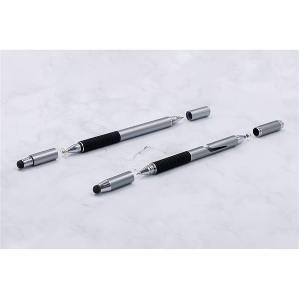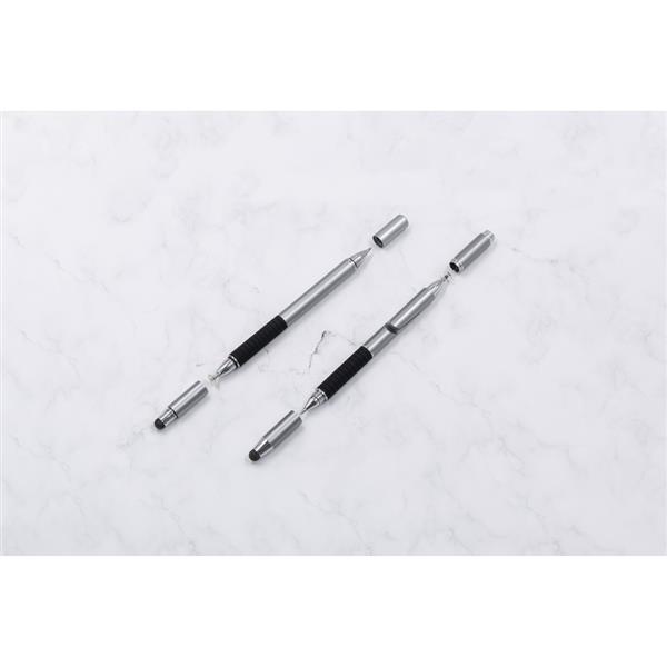 Pióro kulkowe BrandCharger Styllo 2, po przekręceniu trzonu zmienia się z gładkiego pióra kulkowego do papieru w rysik dyskowy do obsługi ekranów dotykowych, sprawdzi się jako upominek w branży kreatywnej, aluminiowa obudowa zapewnia elegancki, profesjonalny wygląd, kompatybilne ze wszystkimi urządzeniami z ekranem dotykowym, nie wymaga baterii, zapakowany w czarne papierowe pudełko, produkt wykonany z aluminium, włókna węglowego i silikonu