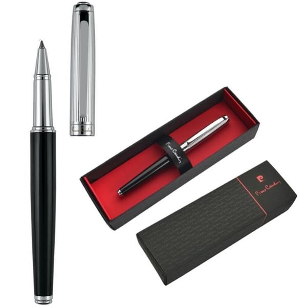 Pióro kulkowe z czarnym, lakierowanym korpusem i srebrnymi elementami. Wyposażone w wysokiej jakości niebieski wkład z końcówką 0,6 mm. W zestawie z wkładem zapasowym piszącym na czarno. Zapakowany w eleganckie pudełko prezentowe z certyfikatem autentyczności Pierre Cardin.