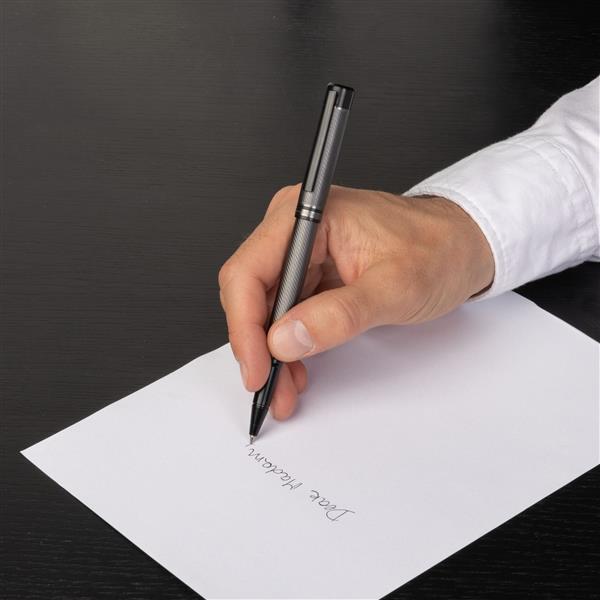 Linia Filament uwydatnia znaczenie zrozumienia potrzeby równowagi. Doskonale wyważona sylwetka oferuje luksusowe wrażenia podczas pisania. Grawerowany wzór, inspirowany architekturą przemysłową, jest unowocześniony przez matowe platerowanie, a czarne paski na środkowym pierścieniu dodają sportowego charakteru. Rozmiar: Dia. 11 / h. 143 mm Kolor: Szary