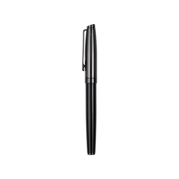 Ekskluzywne pióro kulkowe Pierre Cardin o eleganckim i nowoczesnym designie. Korpus wykonany jest w błyszczącym czarnym kolorze z górną częścią w odcieniu gunmetal. Pióro wyposażone jest w wysokiej jakości niemiecki wkład Schmidt w kolorze niebieskim z końcówką 0,6 mm, gwarantujący płynne i precyzyjne pisanie. W zestawie znajduje się również zapasowy czarny wkład. Całość zapakowana jest w eleganckie pudełko upominkowe z certyfikatem autentyczności.