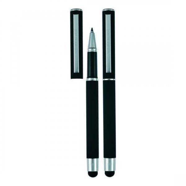 Luksusowe, aluminiowe pióro kulkowe z przyjemną w dotyku powierzchnią soft touch i srebrnymi detalami. Posiada wysokiej jakości niemiecki wkład Schneider w kolorze niebieskim, z końcówką 0,5 mm oraz funkcję touch pen. Zapakowany w eleganckie etui prezentowe z certyfikatem autentyczności Pierre Cardin. Rozmiar: 1,1 x 13,5 cm Kolor: Czarny