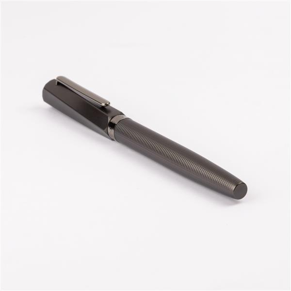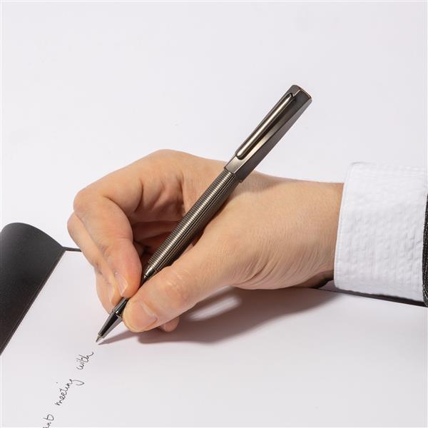 Pióro kulkowe Twist Gun charakteryzuje się solidną konstrukcją. Posiada skręcany wzór na skuwce oraz kontrastujące wzór siatki na korpusie. Pióro zostało wykonane z mosiądzu, posiada wkład piszący na czarno. Rozmiar: Dia. 13 / h. 140 mm Kolor: Szary