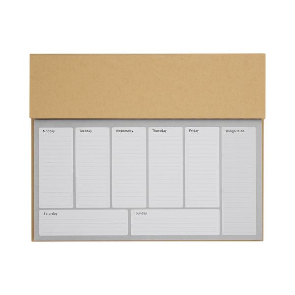 Planner na biurko w sztywnej oprawie. Zawiera 100 kartek z nadrukiem dni tygodnia i listą spraw do zrobienia (80 g/m2), drewnianą linijkę, długopis i papierowe znaczniki (25 sztuk w czterech kolorach, o gramaturze 75 g/m2).