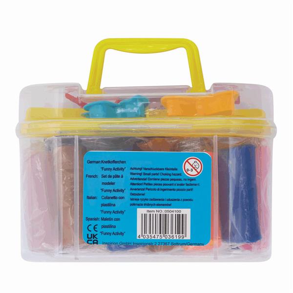 Plastelina FUNNY ACTIVITY zawiera 16 różnych kolorów plasteliny, 2 foremki i 4 narzędzia (kolory i formy foremek oraz narzędzi w poszczególnych zestawach mogą się różnić). Zapakowana w pudełko z uchwytem do przenoszenia.