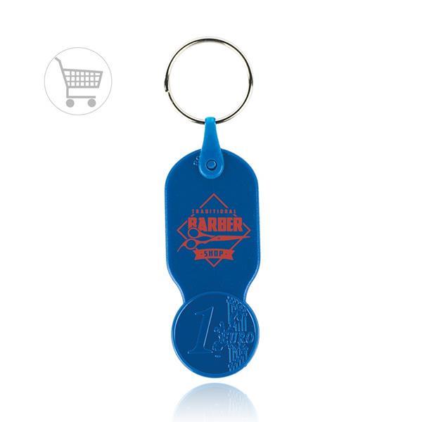 Plastikowy brelok z żetonem do wózka na zakupy (1 €).