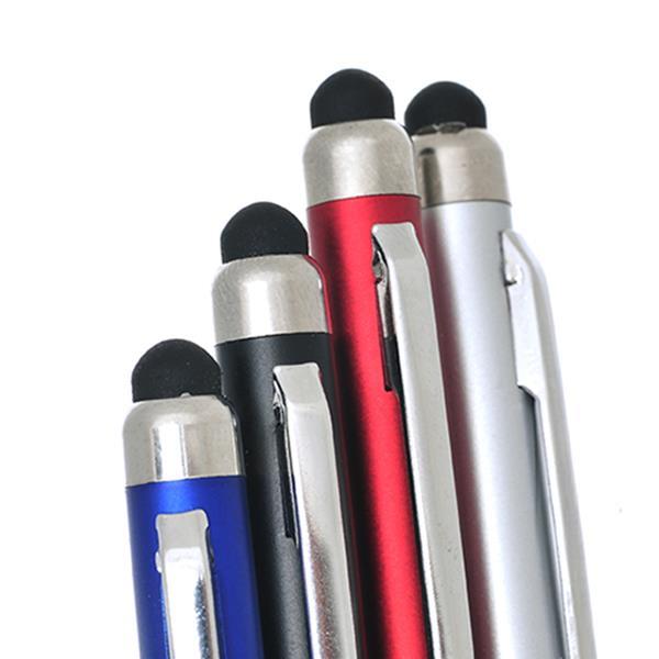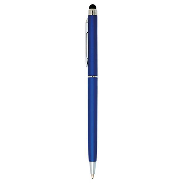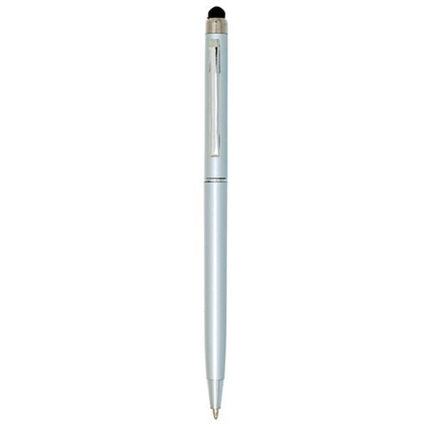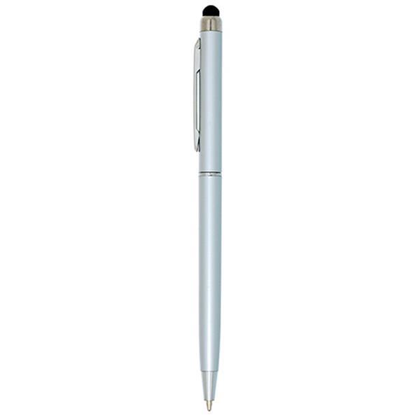 Długopis plastikowy z gumką do obsługi ekranów dotykowych, metalowym klipsem mechanizmem obrotowym, pisze na czarno. Rozmiar: 13,5 x 0,6 cm T1 (tampodruk): 3 x 0,5 DC0 (długopisy, zapalniczki): 3 x 0,5 Kolor: Srebrny