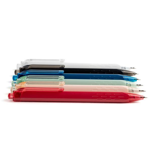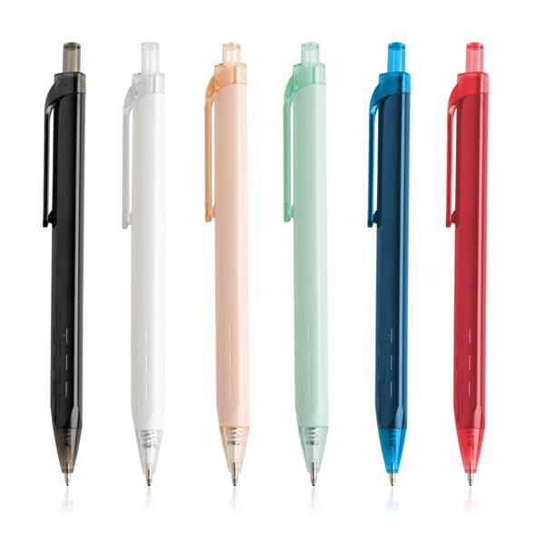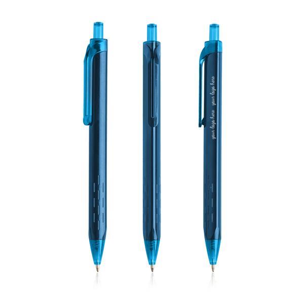 Plastikowy trójkątny długopis. Ten długopis z jednokolorowym korpusem i przezroczystymi detalami jest idealny do znakowania dzięki trójkątnym bokom korpusu. Ten długopis piszący na niebiesko posiada mechanizm wciskany.