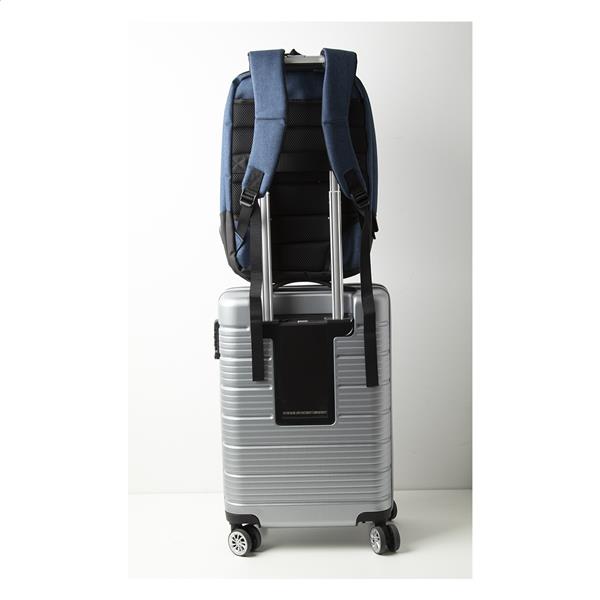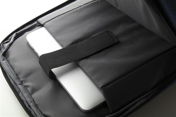 Plecak dwukolorowy z wieloma zapinanymi przegrodami, wyściełanym miejscem na laptop (17”) i tablet oraz ergonomiczną tylną ścianką i paskami. Z przegrodą antykradzieżową. Z zapięciem do walizki i wbudowanym gniazdem USB do power banka. Poliester 400D.