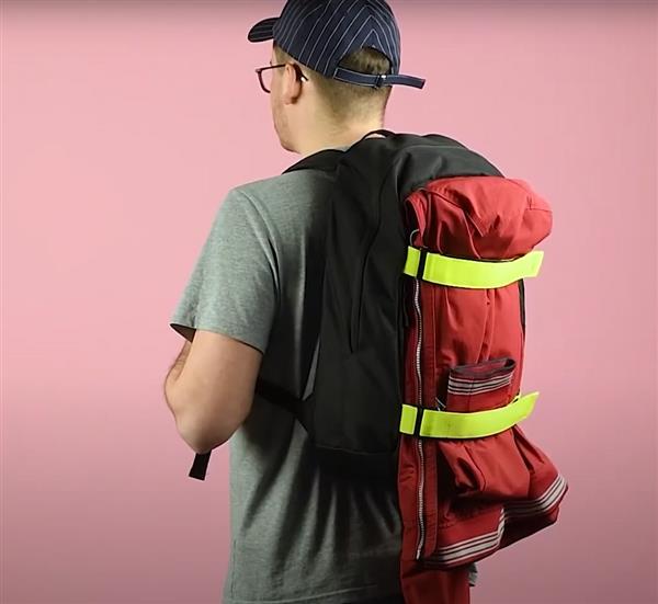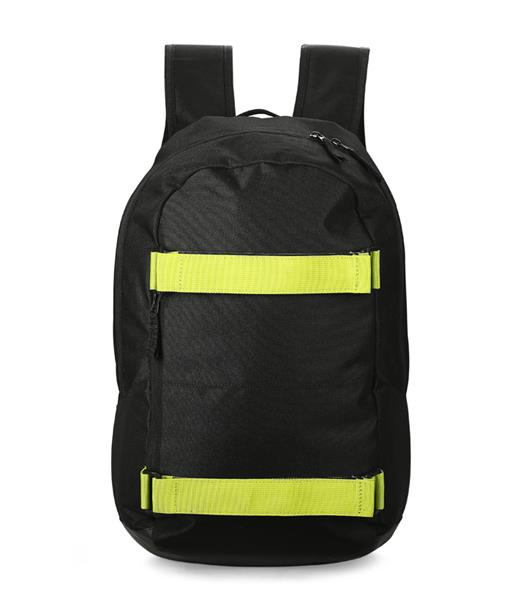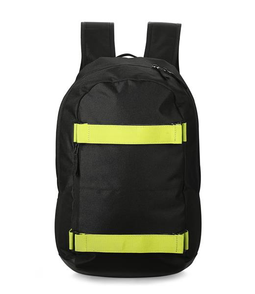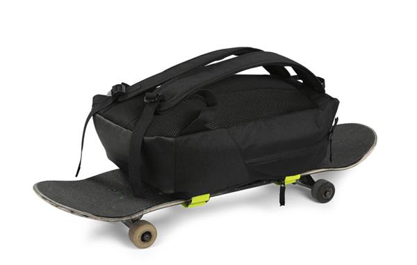 Plecak BOARD wykonany jest z poliestru 600D. Posiada jedną komorę główną zapinaną dwoma suwakami. W środku jest dodatkowa przegroda niezamykana zamkiem oraz siateczkowa kieszeń na kanapkę lub przekąskę zapinana na zamek. Ogromną zaletą plecaka są dwa paski w jaskrawym kolorze zapinane na rzep, które z powodzeniem utrzymają nawet deskorolkę. Plecak jest bardzo wygodny w noszeniu, od strony pleców jest wzmocniony gąbką i miękką siateczką oraz posiada nieprzemakalne dno z powłoką z PVC.