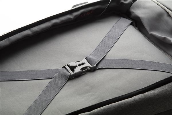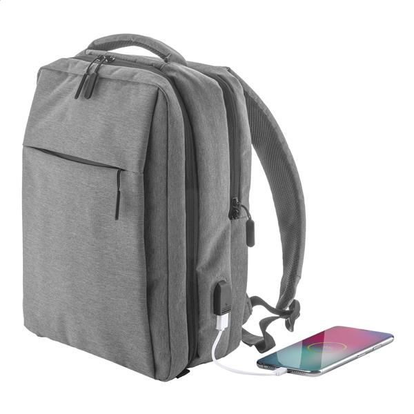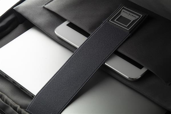 Plecak z wieloma zapinanymi przegrodami, wyściełanym miejscem na laptop (15”) i tablet oraz ergonomiczną tylną ścianką i paskami. Z zapięciem do walizki i wbudowanym gniazdem USB do power banka. Poliester 400D.