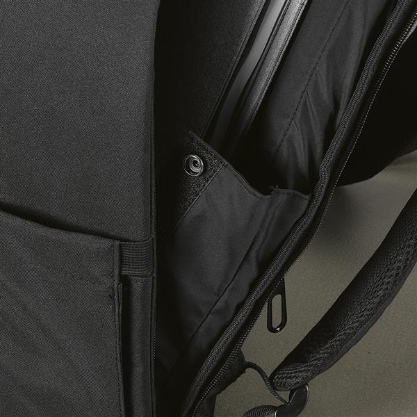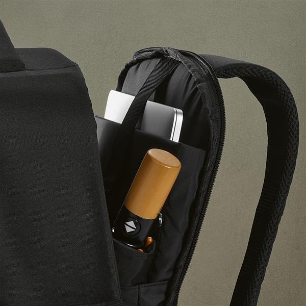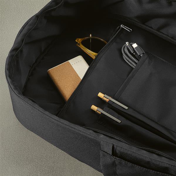 Odkryj komfort w naszym plecaku rPET 16L. Ukryta przednia kieszeń, wyściółka pleców, pasek do wózka, wzmocniony uchwyt i paski na ramiona. Wewnętrzna wyściełana przegroda na laptopa 17” i dyskretne boczne kieszenie na butelki. Zapakowany w indywidualną bawełnianą torbę z recyklingu.
