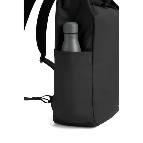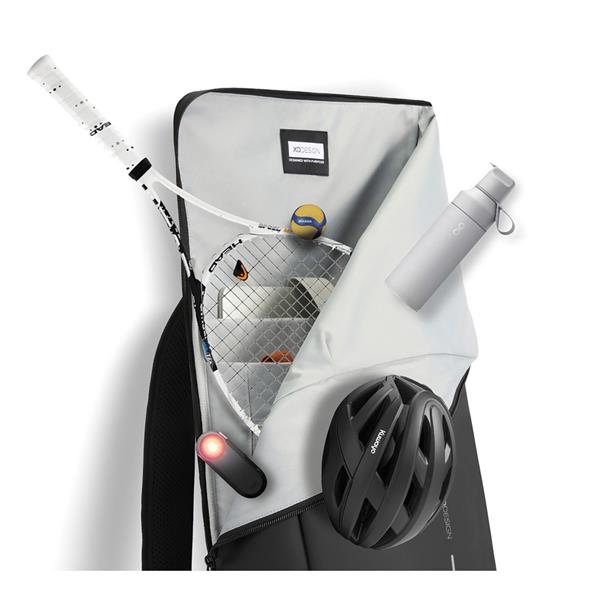 Plecak chroniący przed kieszonkowcami, zwijana przegroda główna i zamek szyfrowy wzmocniony stalą umożliwiający całkowite zamknięcie plecaka, zamek może posłużyć również do przypięcia plecaka do stałego obiektu, ukryte kieszenie do przechowywania dokumentów i kart kredytowych z tyłu torby oraz w pasku na ramię z ochroną RFID, kieszeń boczna, odpinana elastyczna siatka na sprzęt sportowy w komplecie, wewnątrz usztywnione przegrody na laptopa 16″ lub tablet, siateczkowe kieszenie na inne przedmioty osobiste, całkowita zawartość materiałów z recyklingu obliczona w oparciu o wagę całkowitą przedmiotu: 11%, wzór zastrzeżony®
