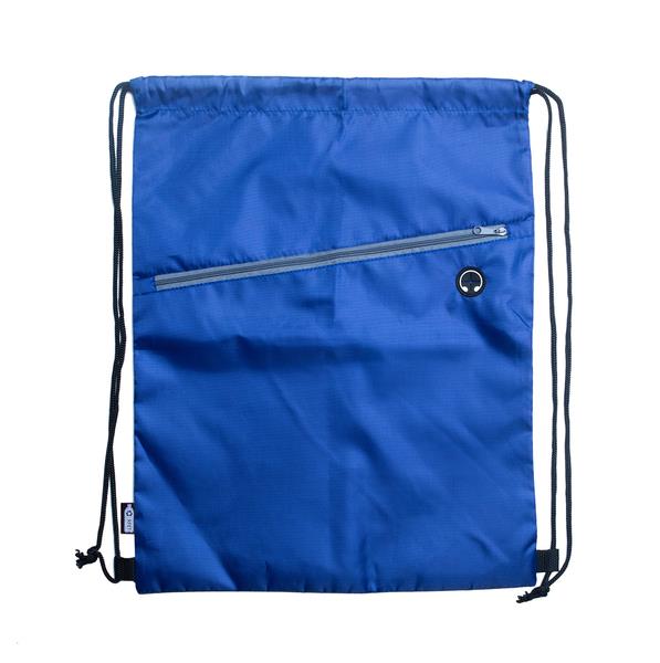 Plecak wykonany z RPET 210D, z kieszonką na zamek oraz otworem na słuchawki. Materiał wyprodukowany z przetworzonych plastikowych butelek.