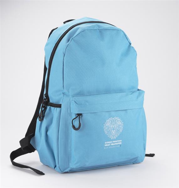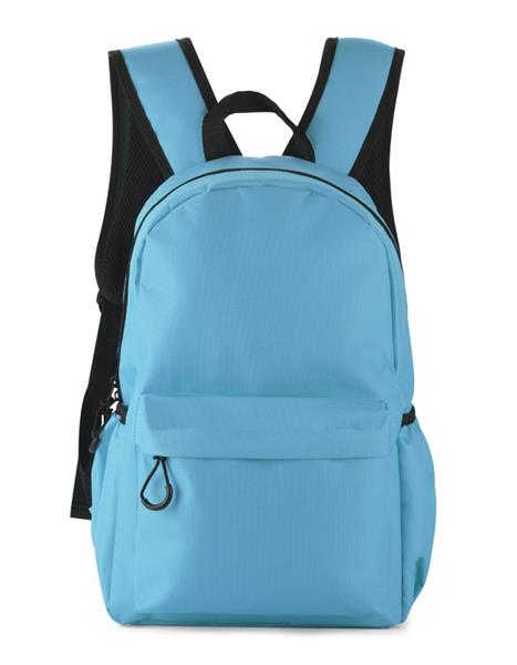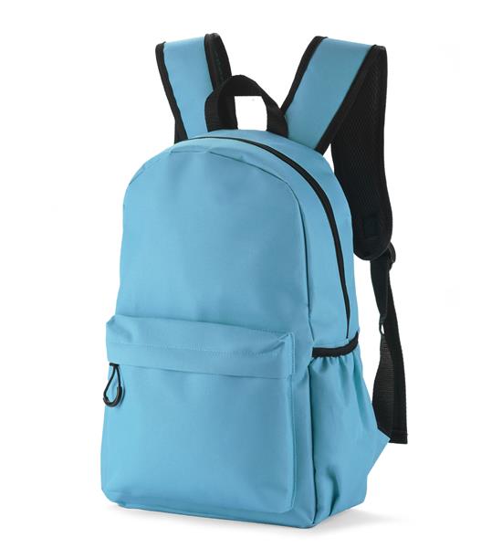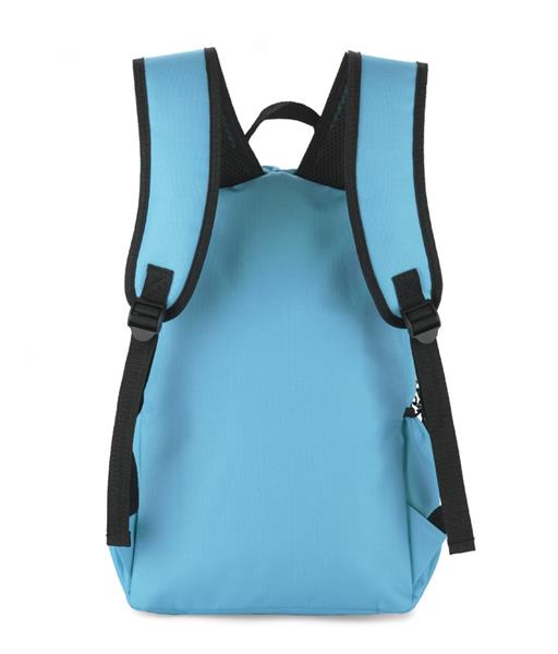 Plecak GINNI wykonany jest z poliestru 600D. Posiada jedną komorę główną zapinaną dwoma suwakami. Z przodu znajduje się spora kieszeń zapinana na zamek, która pomieści potrzebne drobiazgi. Po obu stronach znajdują się otwarte przegrody z gumką mieszczące bidon z wodą. Dno i plecy nie są usztywniane.