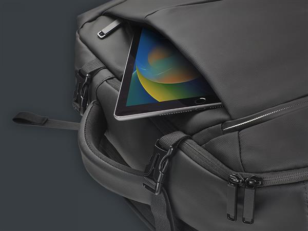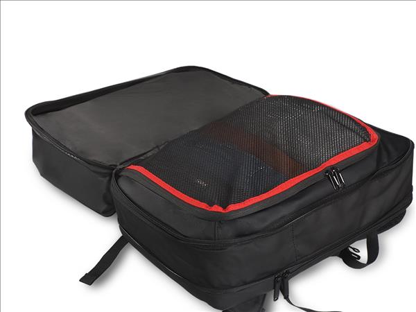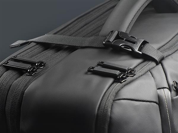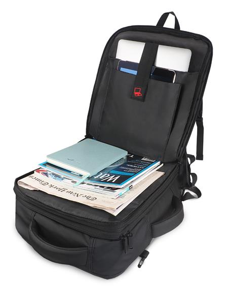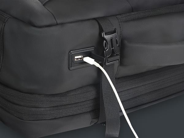 2 uchwyty 2 kieszenie z siatki 4 kieszenie na długopisy 6 kieszeni na dokumenty 6 kieszeni zapinanych na suwak Kieszeń na laptop 15″ Pasek mocujący do uchwytu walizki Pełne otwarcie ułatwiające pakowanie (180°) Suwak regulujący objętość Zewnętrzny port ładowania USB
