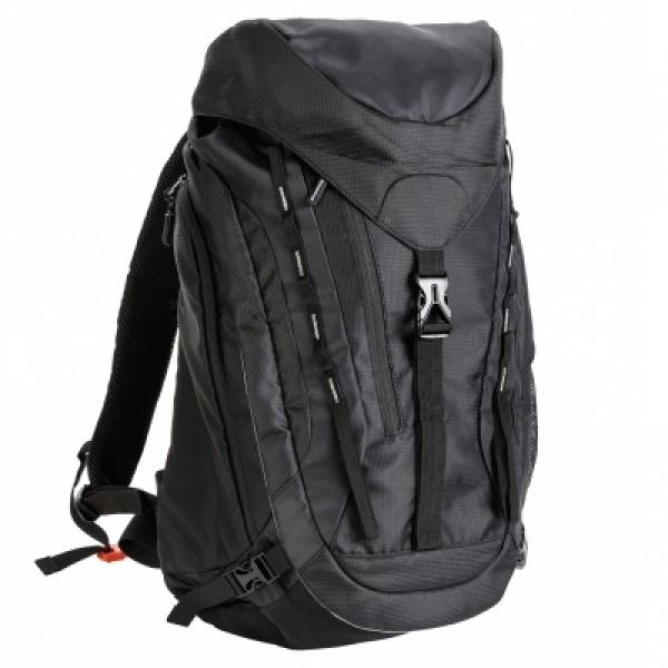 Plecak turystyczny wyposażony w dużą kieszeń główną z przegrodą na laptopa oraz dodatkowe kieszenie takie jak: boczna kieszeń z zamkiem i kieszeń z siateczki na drugim boku. Pas piersiowy wyposażony jest w gwizdek ratunkowy. W zestawie również wodoodporna osłona na plecak dostępna w dolnej kieszeni.