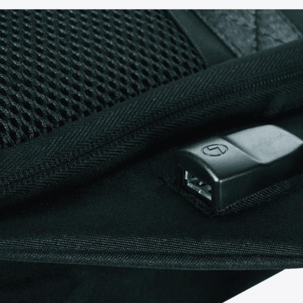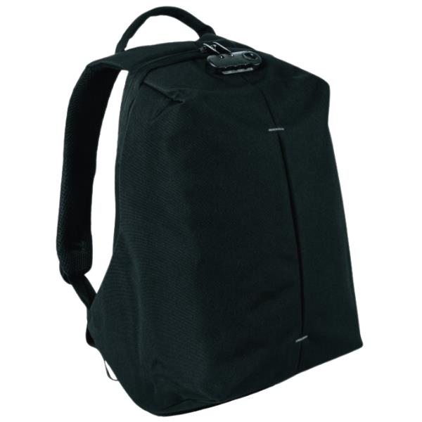 Plecak z zabezpieczeniami przed kradzieżą. Wejście do głównej części plecaka skierowane jest w stronę torby, co utrudnia dostęp komuś innemu. Plecak posiada również blokadę do zabezpieczenia zamków błyskawicznych, ukrytą kieszeń na kartę płatniczą lub klucze, wyściełane miejsce na laptopa 15‘‘ i tablet 10 ”. W zestawie znajduje się również wyjście z kablem USB oraz pasek do przypięcia do walizki. Przednia powierzchnia jest wyposażona w odblaskowe akcesoria. Pojemność plecaka to 20,5 l.