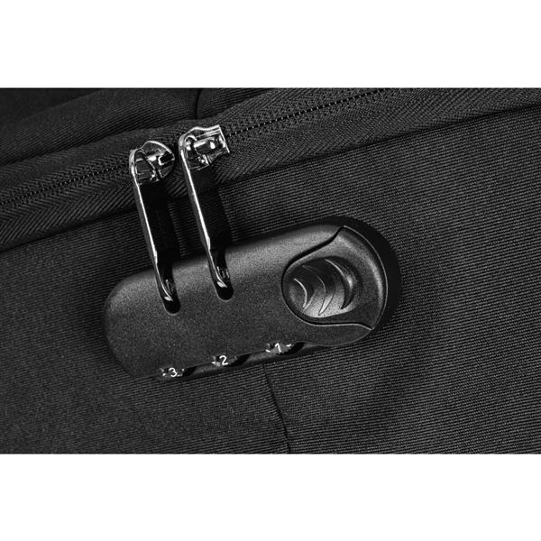 Plecak z zabezpieczeniami przed kradzieżą. Wejście do głównej części plecaka skierowane jest w stronę torby, co utrudnia dostęp komuś innemu. Plecak posiada również blokadę do zabezpieczenia zamków błyskawicznych, ukrytą kieszeń na kartę płatniczą lub klucze, wyściełane miejsce na laptopa 15‘‘ i tablet 10 . W zestawie znajduje się również wyjście z kablem USB oraz pasek do przypięcia do walizki. Przednia powierzchnia jest wyposażona w odblaskowe akcesoria. Pojemność plecaka to 20,5 l.