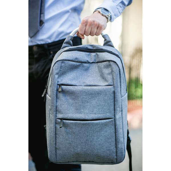 Wytrzymały plecak, któremu szara melanżowa faktura materiału nadaje surowy, miejski wygląd. Posiada 1 dużą kieszeń na zamek, 2 przednie kieszenie z ukrytymi zamkami, aluminiowy uchwyt oraz wygodne paski na ramię wyściełane pianką. Gramatura 450 g/m2. Pojemność 20 litrów.