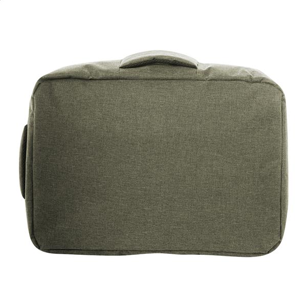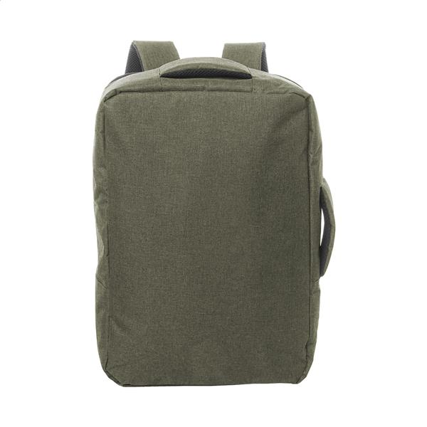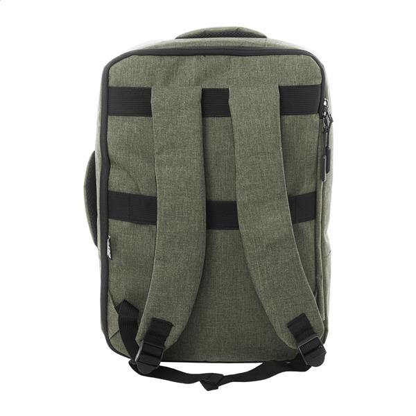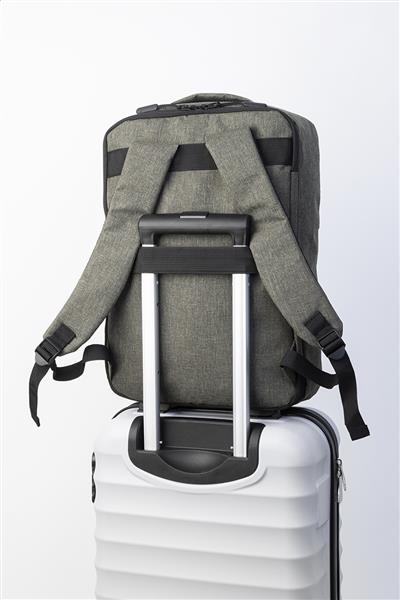 Dwufunkcyjny plecak RPET i zarazem torba na dokumenty z przegrodą na suwak i wyściełaną przegrodą na laptopa (15″). Z paskiem na wózek, wyściełanym tyłem i paskami na ramiona. Poliester RPET 300D, z charakterystyczną metką RPET.