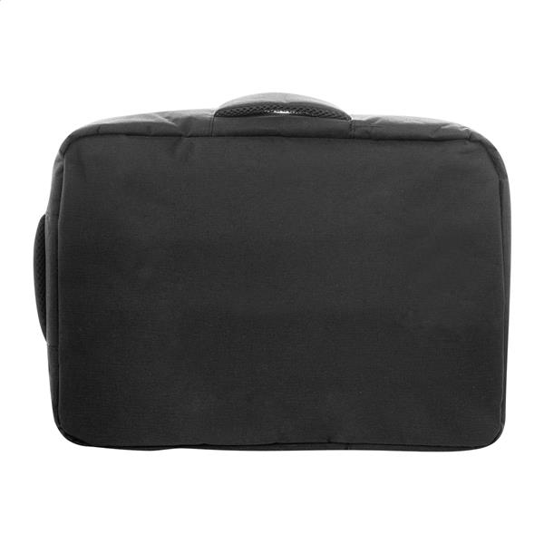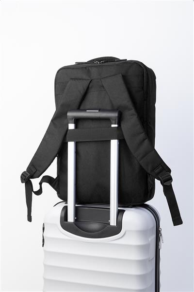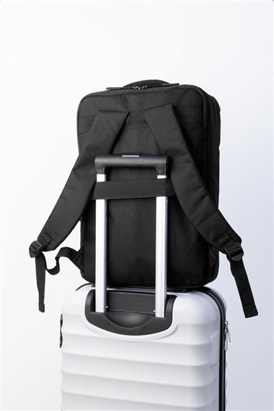 Dwufunkcyjny plecak RPET i zarazem torba na dokumenty z przegrodą na suwak i wyściełaną przegrodą na laptopa (15″). Z paskiem na wózek, wyściełanym tyłem i paskami na ramiona. Poliester RPET 300D, z charakterystyczną metką RPET.