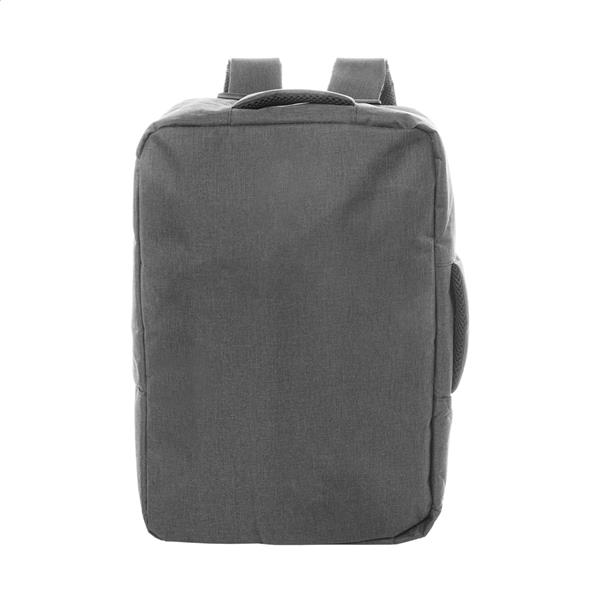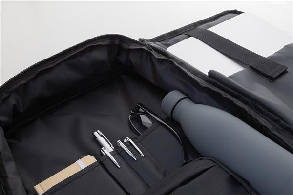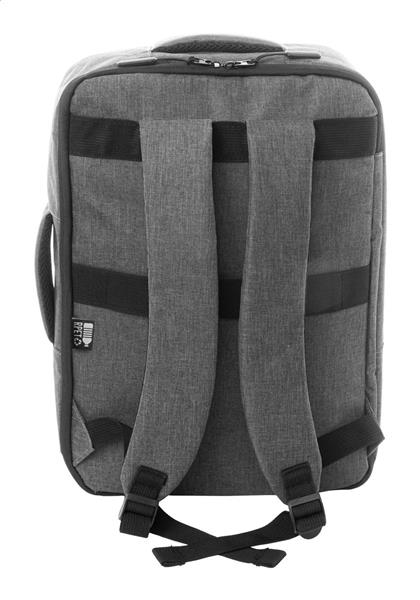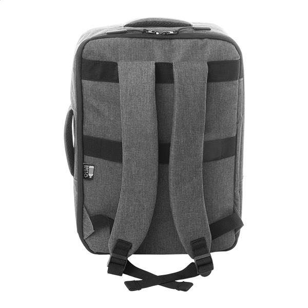 Dwufunkcyjny plecak RPET i zarazem torba na dokumenty z przegrodą na suwak i wyściełaną przegrodą na laptopa (15″). Z paskiem na wózek, wyściełanym tyłem i paskami na ramiona. Poliester RPET 300D, z charakterystyczną metką RPET.