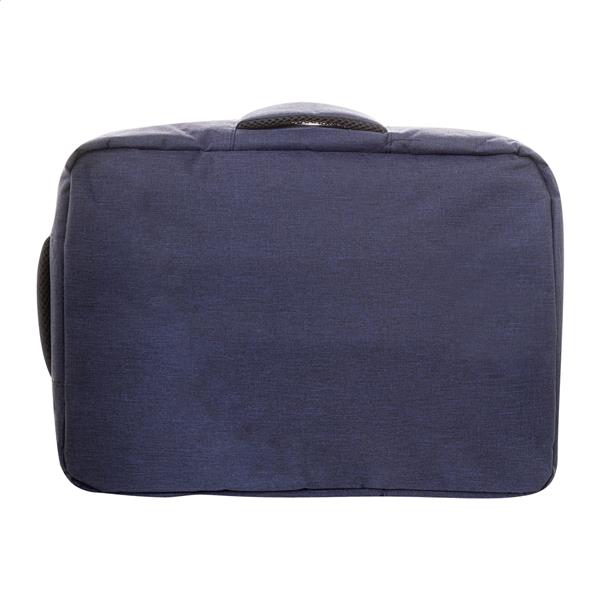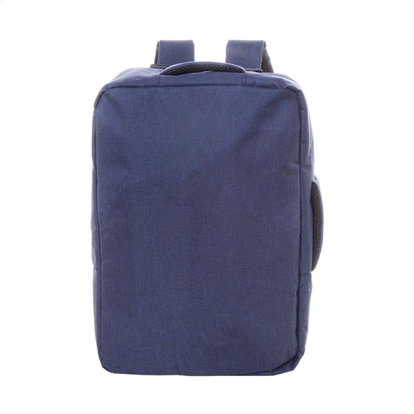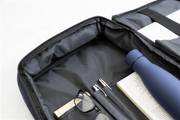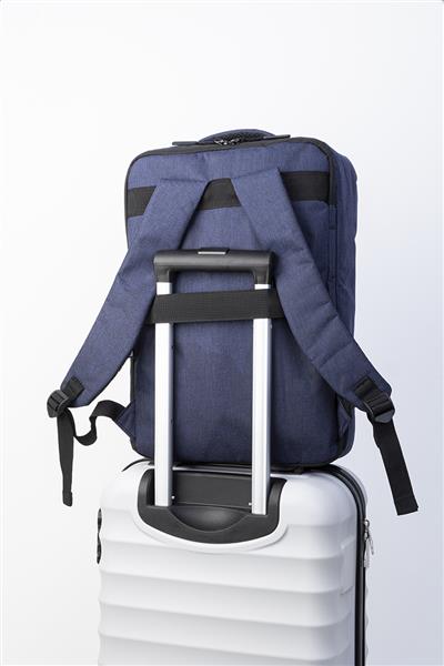 Dwufunkcyjny plecak RPET i zarazem torba na dokumenty z przegrodą na suwak i wyściełaną przegrodą na laptopa (15″). Z paskiem na wózek, wyściełanym tyłem i paskami na ramiona. Poliester RPET 300D, z charakterystyczną metką RPET.
