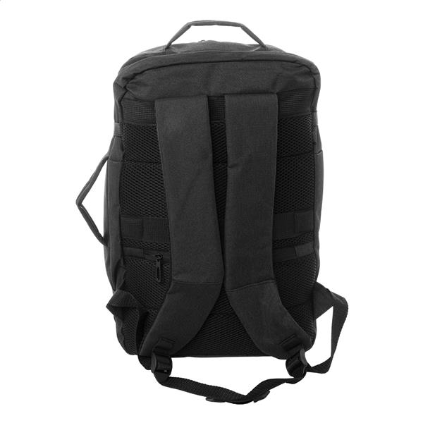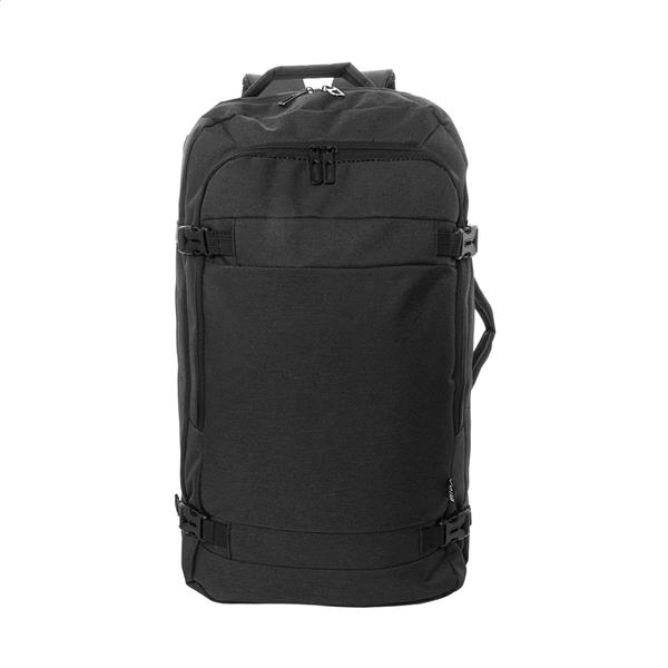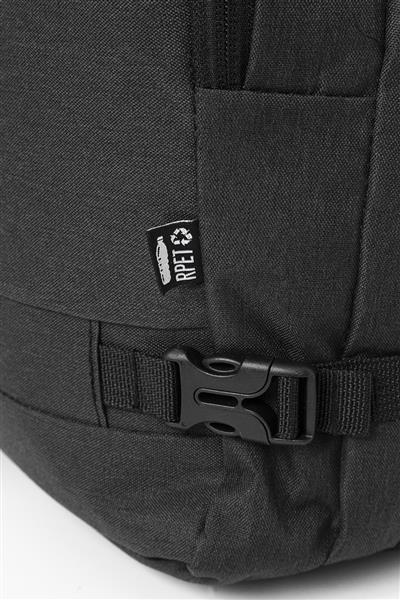 Dwufunkcyjny plecak RPET i zarazem torba na dokumenty z 2 przegrodami na suwak, kieszenią przednią na suwak i wyściełaną przegrodą na laptopa (15″). Z kieszenią antykradzieżową, paskiem na wózek, wyściełanym tyłem i paskami na ramiona. Poliester RPET 600D, z charakterystyczną metką RPET.