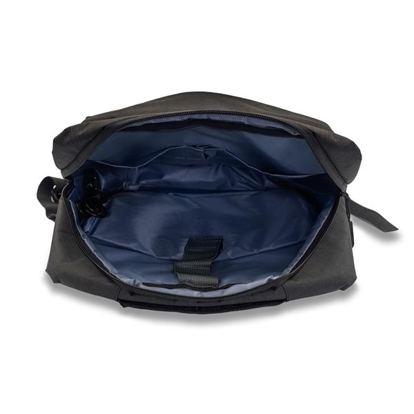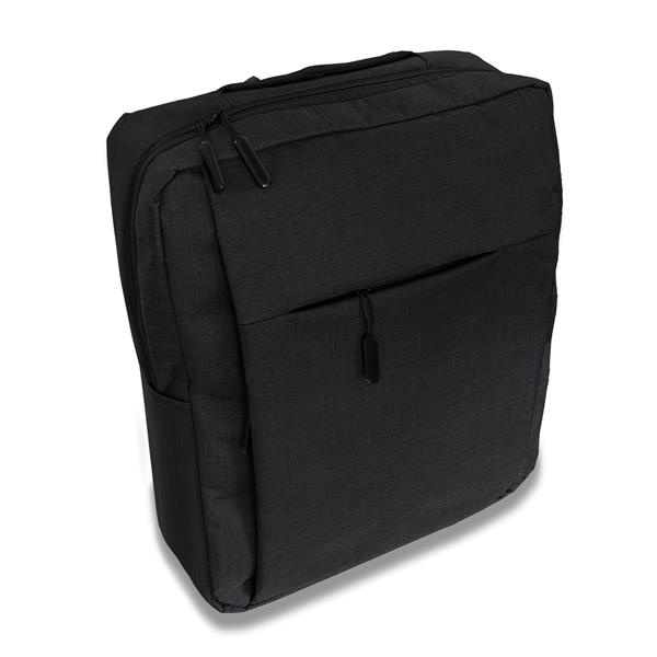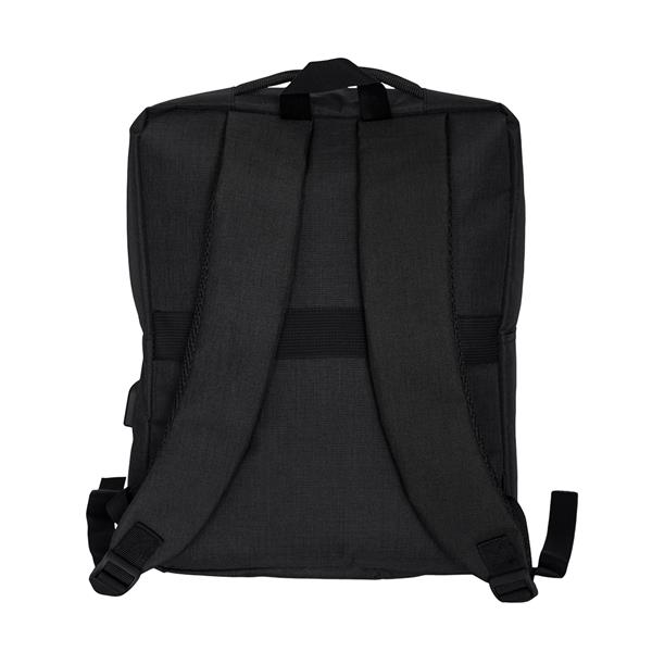 Plecak z przegrodą na laptop 15″. Na zewnątrz dwie kieszenie zamykane na zamek, z boku gniazdo USB, dzięki któremu można podpiąć swój smartfon do powerbanka. Wewnętrzny kabel USB w zestawie. Miękkie wygodne plecy i szelki pokryte siateczką. Plecak posiada pasek na uchwyt walizki. Dodatkowo wewnątrz przegródki na akcesoria.