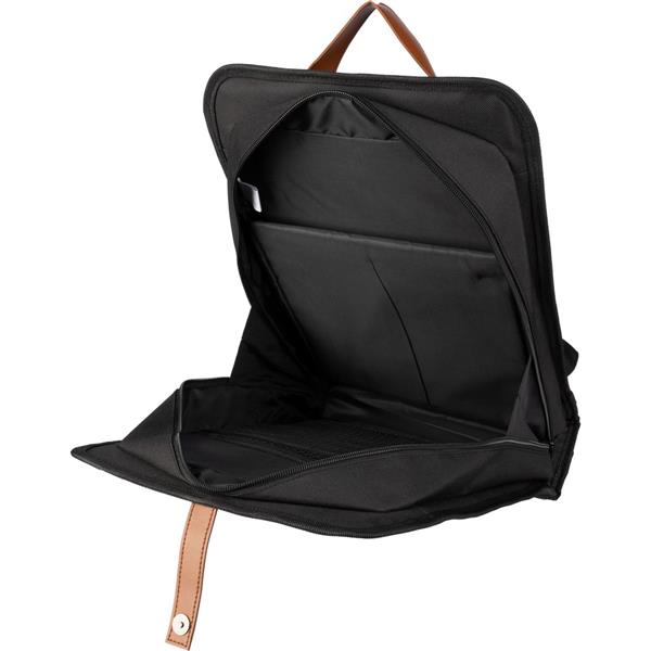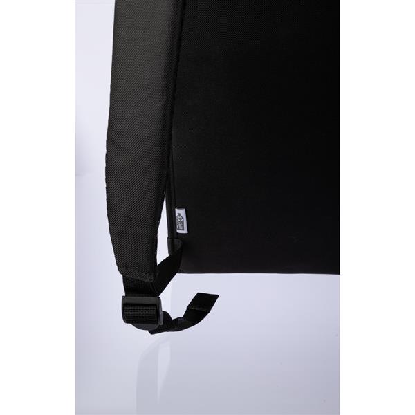 Plecak na laptopa 15″ wykonany z charakterystycznej tkaniny Oxford, która zwiększa odporność na zachlapania, kieszeń na laptopa, wewnętrzna kieszeń z siatkami, regulowane paski na ramię, uchwyt do zawieszania i zamknięcie na magnes, można w nim przenieść książki, laptopa oraz drobne zakupy lub przybory, produkt wykonany z RPET