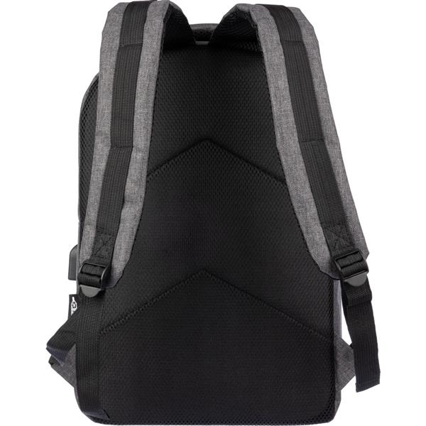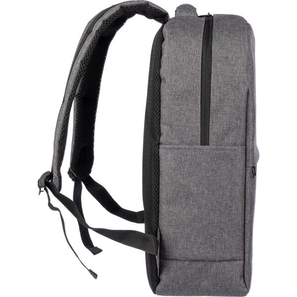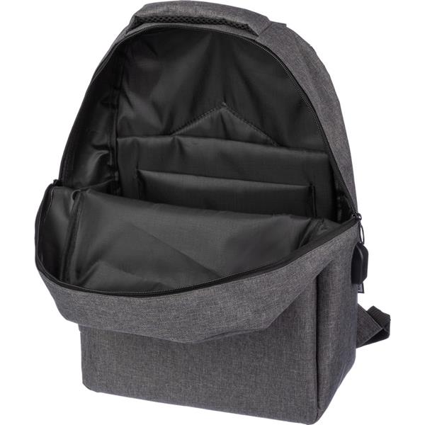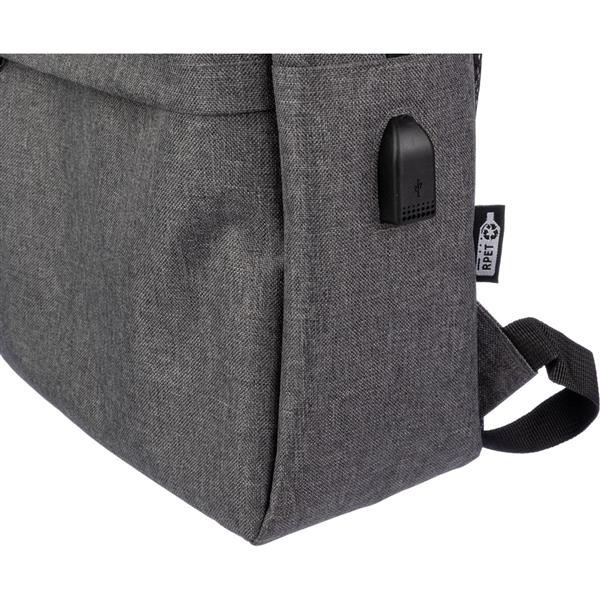 Plecak na laptopa 15″, wewnątrz plecaka znajduje się port USB z kablem w środku do ładowania urządzeń, duża kieszeń zamykana na zamek, kieszeń przednia zamykana na zamek, wewnętrzna przegroda na urządzenia do 15″, wewnętrzna przegroda na urządzenia do 10″, regulowane paski na ramię, można w nim przenieść książki, laptopa oraz drobne zakupy lub przybory, produkt wykonany z RPET
