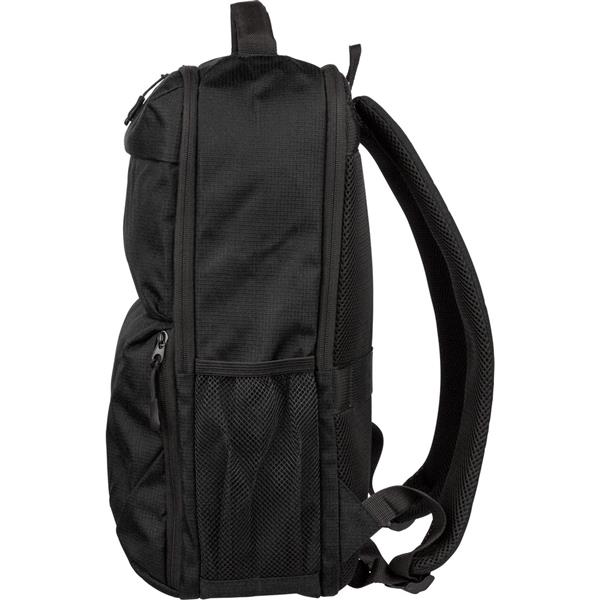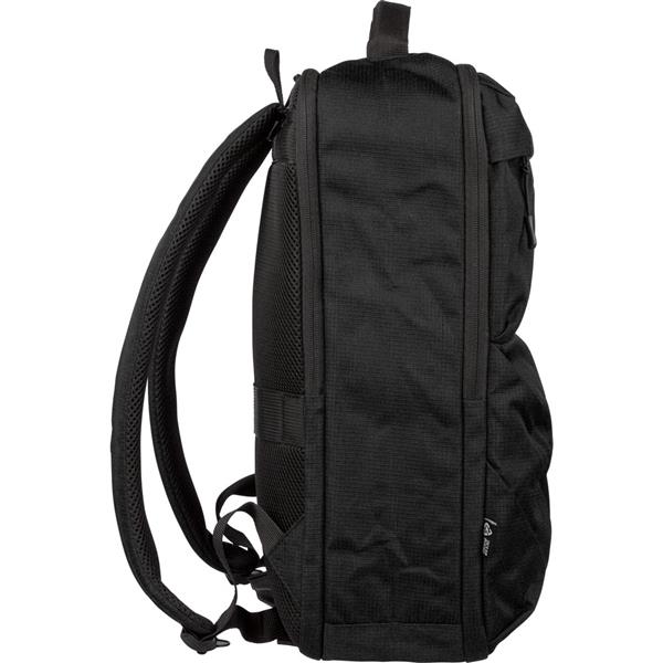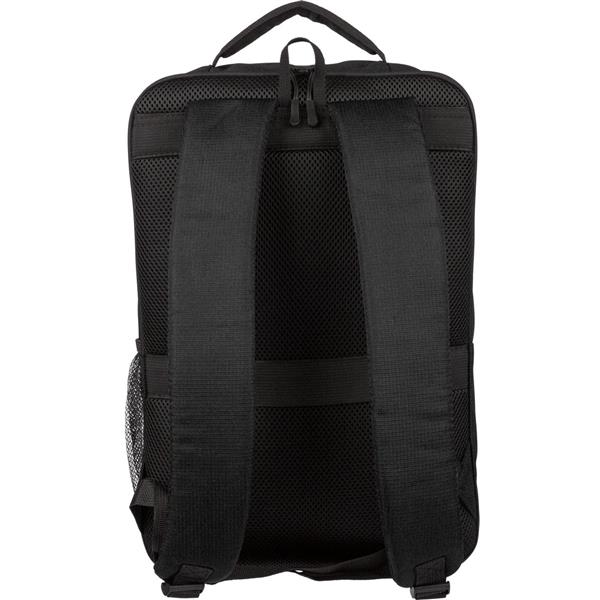Plecak na laptopa 15″ o pojemności 20 litrów, kieszeń główna zapinana na zamek, przegroda na laptopa 15″, dwie małe kieszenie przednie zapinane na zamek, uchwyt ułatwiający noszenie, kieszeń boczna z siatką, wentylowane paski do noszenia na ramieniu, pasek do przymocowania do walizki, ikona OBP na metce, produkt wykonany z RPET 300D