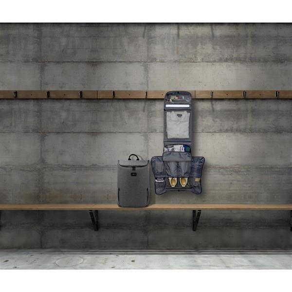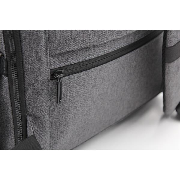 Plecak na laptopa 15,6″ BrandCharger Marco Polo, łatwo przekształca się z plecaka w organizer do odzieży, wodoodporny, pomieści kompletny strój, buty i inne niezbędne rzeczy, sprawdzi się na weekendowe wypady lub podróże służbowe, ukryte kieszenie, wyściełana przegroda na laptopa 15,6″, pasek umożliwiający przypinanie do wózka, kieszeń zabezpieczająca przed kradzieżą i odblaskowymi detalami, produkt wykonany z poliestru i RPET