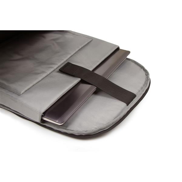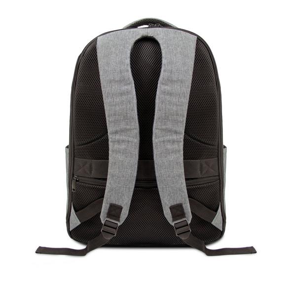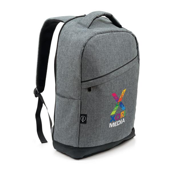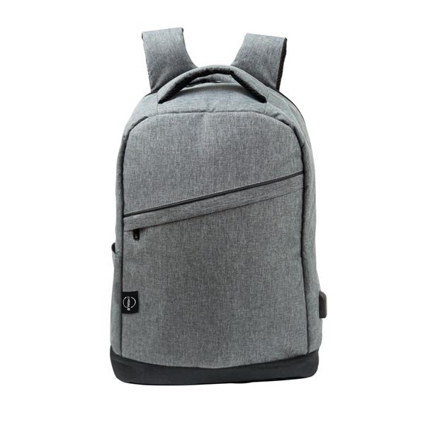 Plecak na laptopa 15,6″ B’RIGHT, wykonany z RPET, zgodny z certyfikatem GRS (Global RecycIed Standard), przegroda główna i kieszeń przednia na zamek błyskawiczny, miękka przegroda na laptopa, różne przegrody w środku w tym 1 na zamek błyskawiczny (z możliwością odczepienia, mocowana na rzep), 1 kieszeń boczna, 1 zewnętrzna kieszeń na zamek błyskawiczny na plecach, pasek do zamocowania na torbie podróżnej, port USB z kablem do ładowania (power-bank nie jest dołączony), miękki tył i regulowane paski na ramię