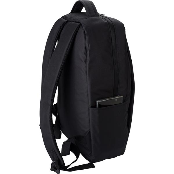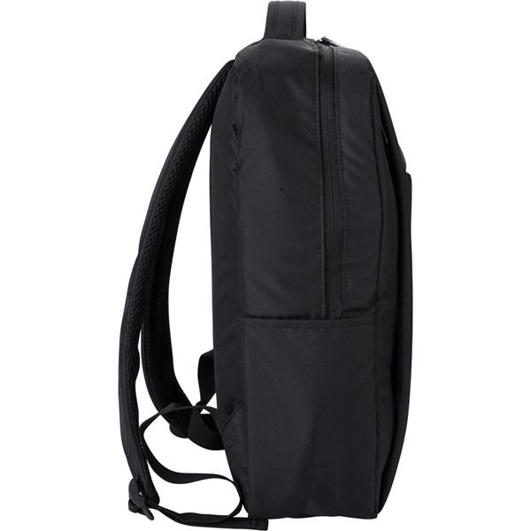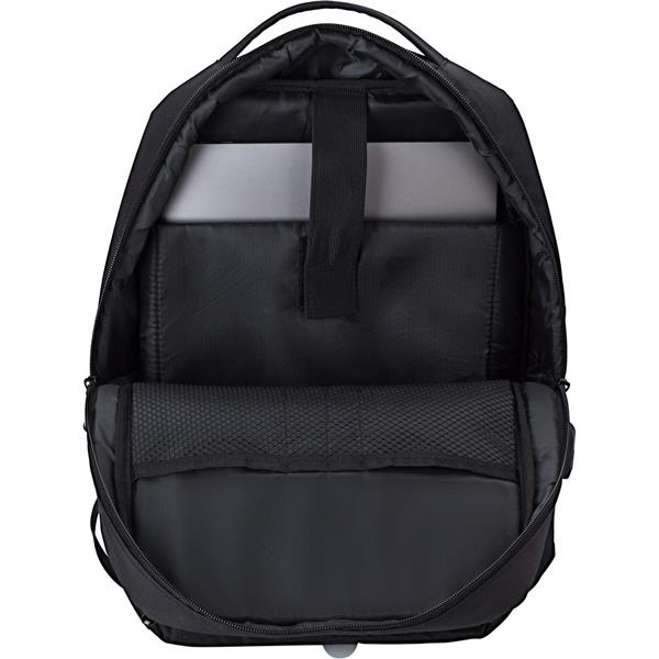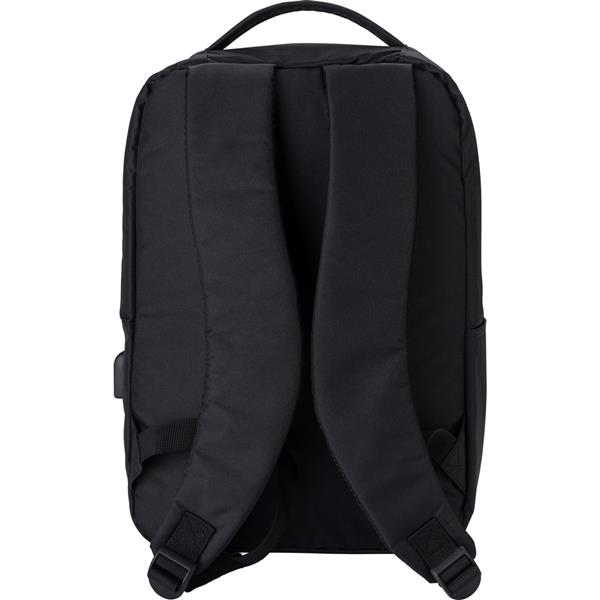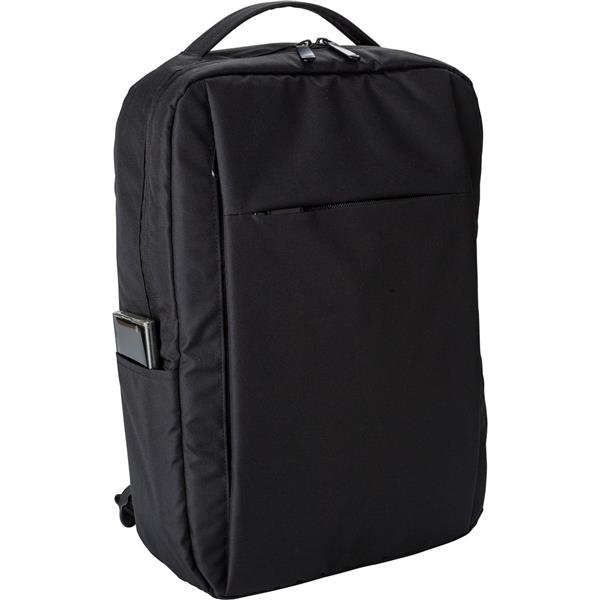 Plecak na laptopa 16″, wykonany z RPET, przegroda główna i kieszeń przednia na zamek błyskawiczny, miękka przegroda na laptopa, różne przegrody w środku, zintegrowany port USB do ładowania telefonów (power-bank nie jest dołączony), boczna kieszeń, regulowane paski na ramię