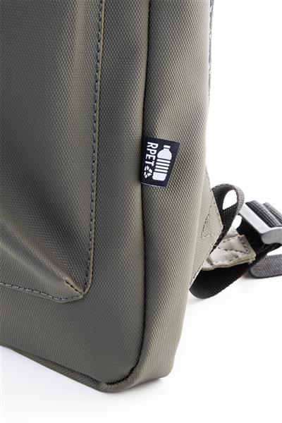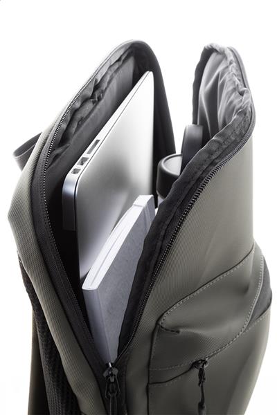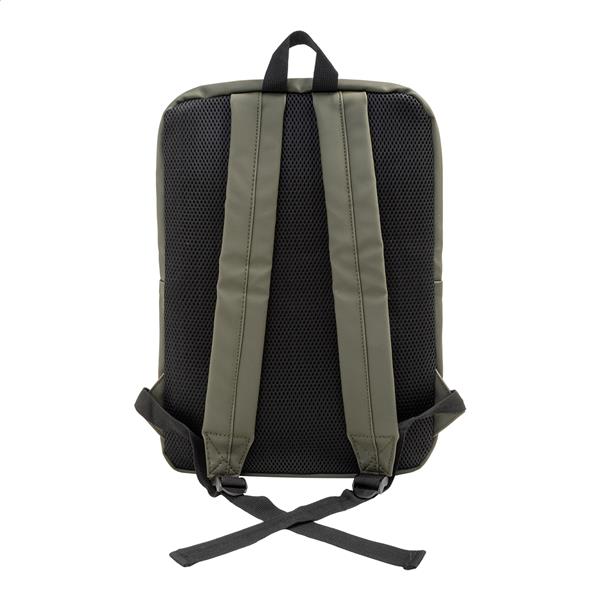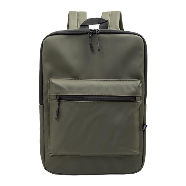 Wodoodporny, smukły plecak na laptopa RPET z przegrodą na laptopa (15″) zapinaną na suwak i kieszenią przednią zapinaną na suwak. Z wyściełanym tyłem i paskami na ramiona. Poliester RPET 600D powlekany poliuretanem, z charakterystyczną metką RPET.