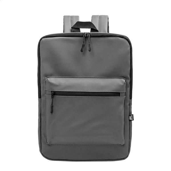 Wodoodporny, smukły plecak na laptopa RPET z przegrodą na laptopa (15″) zapinaną na suwak i kieszenią przednią zapinaną na suwak. Z wyściełanym tyłem i paskami na ramiona. Poliester RPET 600D powlekany poliuretanem, z charakterystyczną metką RPET.