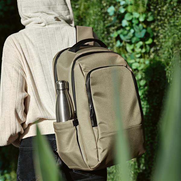 Podkreśl swój styl dzięki naszemu wodoodpornemu dwukolorowemu plecakowi z nylonu pochodzącego z recyklingu. Posiada boczną, wyściełaną przegrodę na laptopa 17″, wodoodporne zamki błyskawiczne i przednią kieszeń. Dostarczany w indywidualnej bawełnianej torbie z recyklingu. Dostępny w ciemnych kolorach.