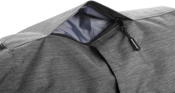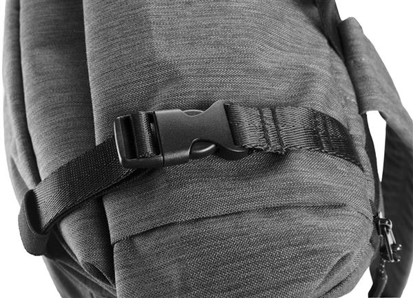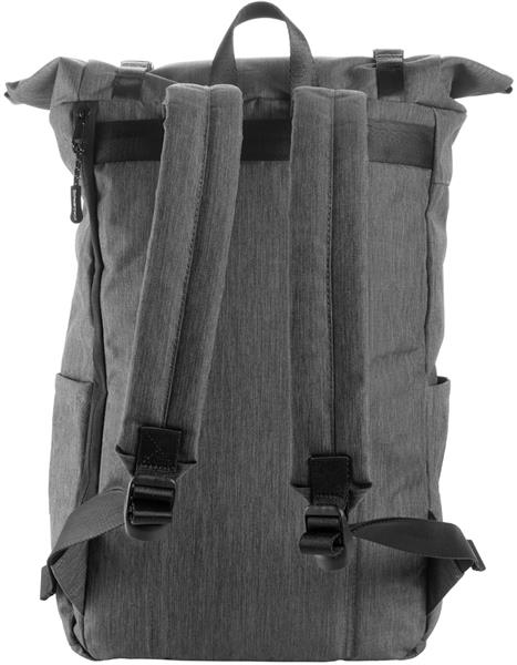Plecak ze zwijanym zamknięciem, wyposażony w dwie frontowe kieszenie zapinane na zamek, dwie boczne kieszonki, zamek z tyłu zapewniający dostęp do dużej komory głównej, która została wydzielona na jedną dużą kieszeń oraz dwie małe – na akcesoria. Po zrolowaniu górnej części plecaka całość zamykamy dwoma paskami z plastikowymi klamerkami. Plecak posiada watowane szelki i plecy.
