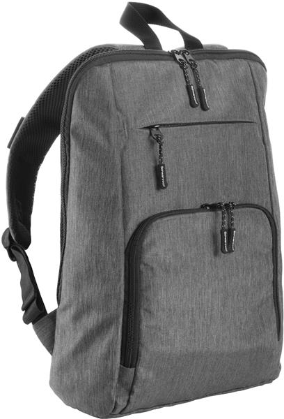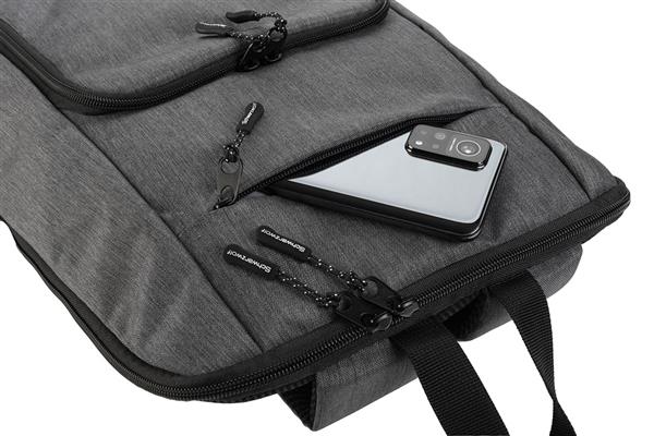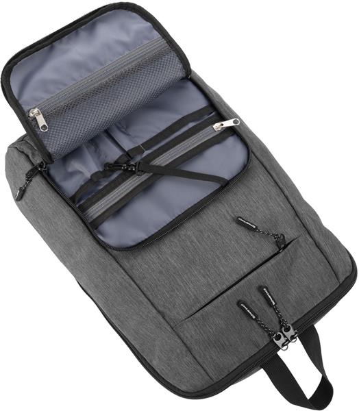 Lekki i kompaktowy plecak wyposażony w dużą komorę główną z wyściełaną przegródką na laptopa, małą kieszonkę z przodu, zamykaną na zamek oraz dużą kieszeń z wieloma przegródkami (małą kieszonką, kieszonką z siatki, karabińczykiem oraz organizerem na długopisy i dokumenty). Pojemność: 15l.