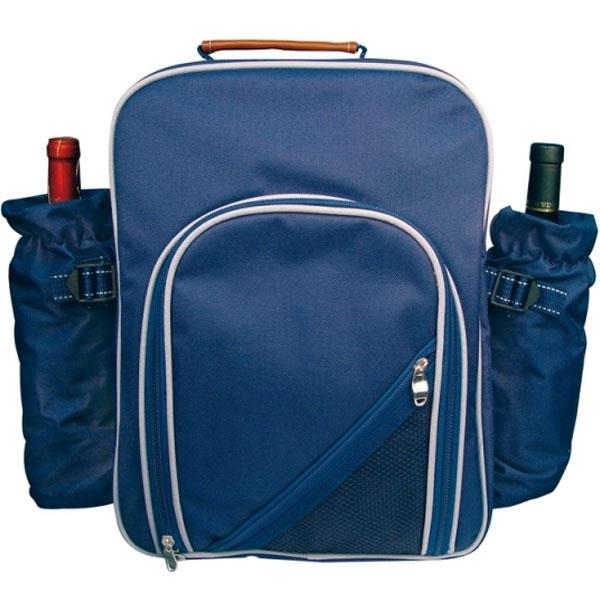 Plecak piknikowy VIRGINIA w niebieskim kolorze zawiera zestaw dla 4 osób, m.in.: komorę chłodzącą, plastikowy zestaw naczyń i sztućców, małą deskę, korkociąg, pojemniki na sól i pieprz oraz nóż.