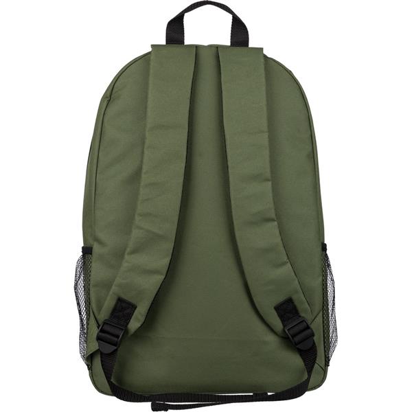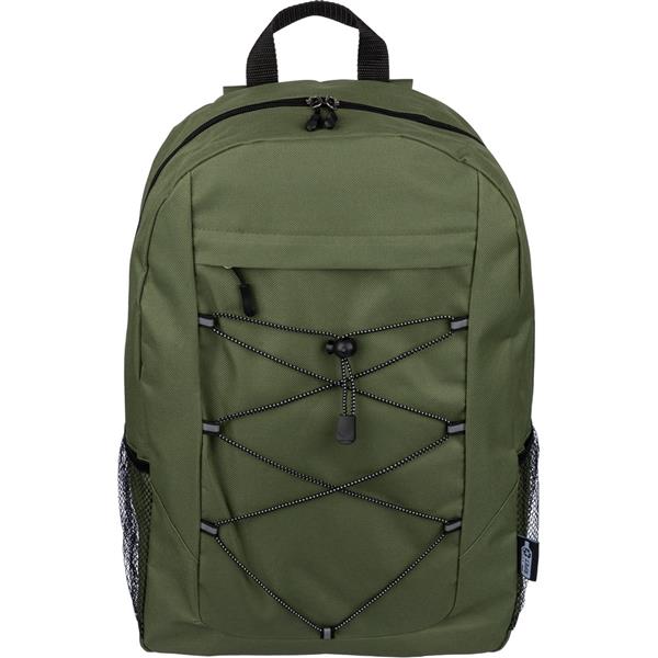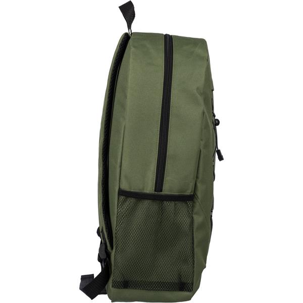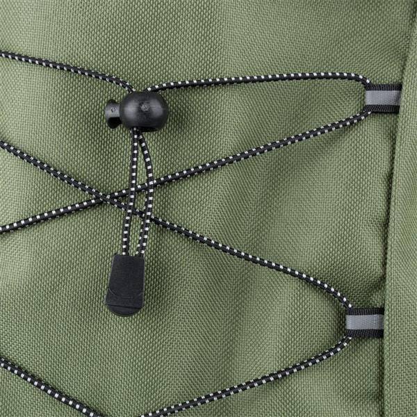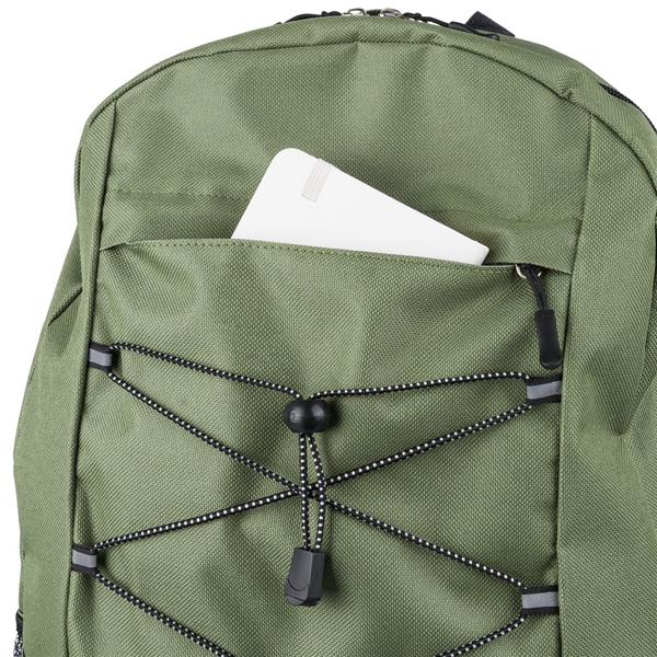 Plecak podróżny, siatkowate kieszenie po obu stronach, elastyczne sznurki z przodu do przymocowania butelki albo koca, zaciskane zamknięcie, mała kieszeń zapinana na zamek z przodu, kieszeń główna zapinana na zamek, ikona RPET na metce, produkt wykonany z RPET, poliestru i elastanu